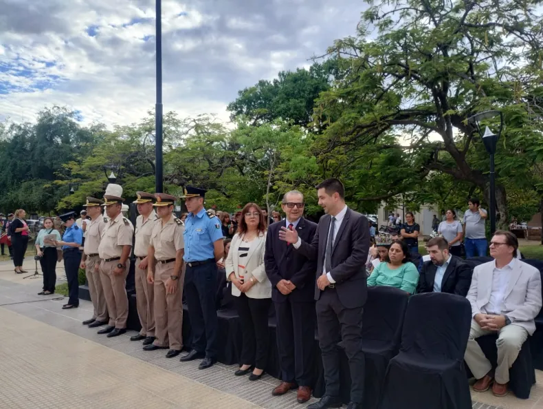 Previo a este sencillo acto, se llevó a cabo otro en la Plaza San Martín, donde se izaron la bandera Nacional y las de las colectividades. Al evento asistieron referentes de instituciones y entidades intermedias, funcionarios, fuerzas de seguridad, excombatientes de Malvinas, colectividades y vecinos de la ciudad. Posteriormente, los presentes participaron del Tedeum en la Catedral San Roque.