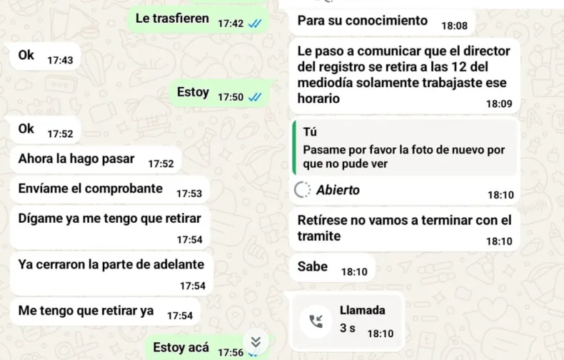 El 17 de febrero, la joven contactó telefónicamente a un supuesto gestor a través de un conocido, envió su documentación y transfirió $ 165.000 a una billetera virtual. El supuesto gestor le envió una foto de la licencia y le pedía que le pasara más dinero, por lo que la mujer fue hasta la Dirección de Tránsito el pasado viernes 28 de febrero para solicitar una respuesta. En ese momento, se enteró de que todo era falso, no había licencia tramitada y el gestor no existía.