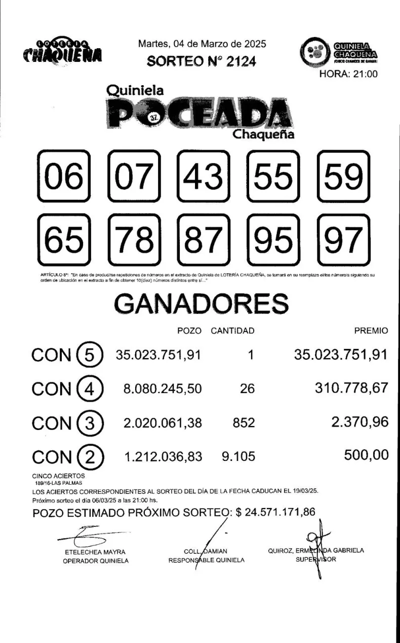El sorteo N° 2124 de La Poceada Chaqueña dejó un nuevo millonario en Las Palmas. Allí, un vecino de la localidad acertó en los cinco números del ticket y se quedó con un pozo de 35.023.751 de pesos. Los números ganadores fueron: 06,07,43,55,59,65,78,87,95 y 97.