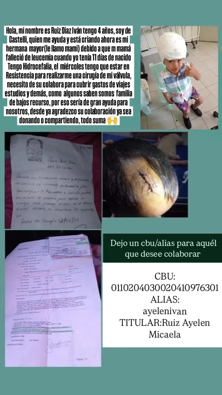 Iván Ruiz Díaz, un niño de 4 años oriundo de Castelli, atraviesa una difícil situación de salud y su familia solicita la colaboración de la comunidad para costear su tratamiento. Iván padece hidrocefalia, una condición que afecta la acumulación de líquido en el cerebro, y necesita con urgencia una nueva válvula para drenar el exceso de fluido. Sin embargo, el costo del dispositivo asciende a $ 45.550.000, una suma imposible de afrontar para su hermana Ayelén, quien se hace cargo de él tras el fallecimiento de su madre.