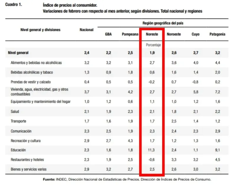 El NEA registró la inflación más baja del país en febrero, con un 1,9%