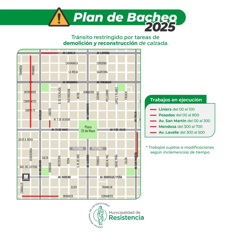La Municipalidad de Resistencia, en conjunto con la Dirección de Vialidad Provincial, informa a los vecinos sobre los trabajos en curso del Plan de Bacheo 2025, que se están llevando a cabo en diversas arterias de la ciudad.