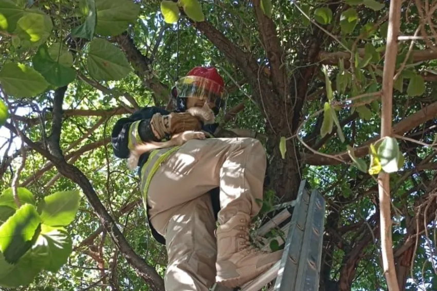 El animal quedó varado en una gran altura y fue salvado por los efectivos, regresando sano y salvo con su dueña.