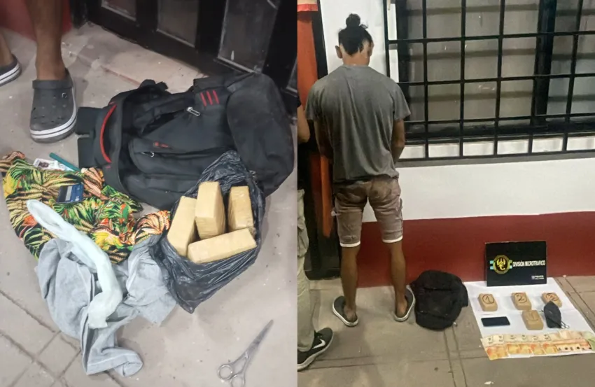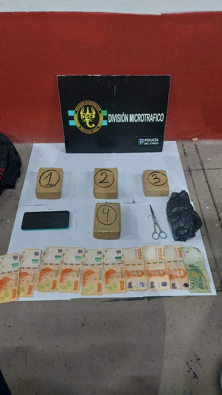 En su poder, la policía encontró cuatro paquetes rectangulares envueltos en cinta beige con un total de 1.330 gramos de marihuana, además de una bolsa con restos de sustancia vegetal, un teléfono celular, una tijera metálica y la suma de $ 9.500 en efectivo.