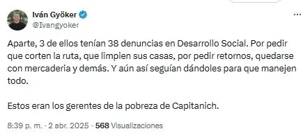 Además del manejo de becas, Gyöker aseguró que tres de los detenidos acumulaban 38 denuncias en Desarrollo Social por presuntas irregularidades. Entre los hechos denunciados se mencionan extorsiones a beneficiarios, pedidos de retornos, apropiación de mercadería y exigencias para realizar tareas ajenas a los programas sociales, como cortes de ruta y limpieza de viviendas particulares.