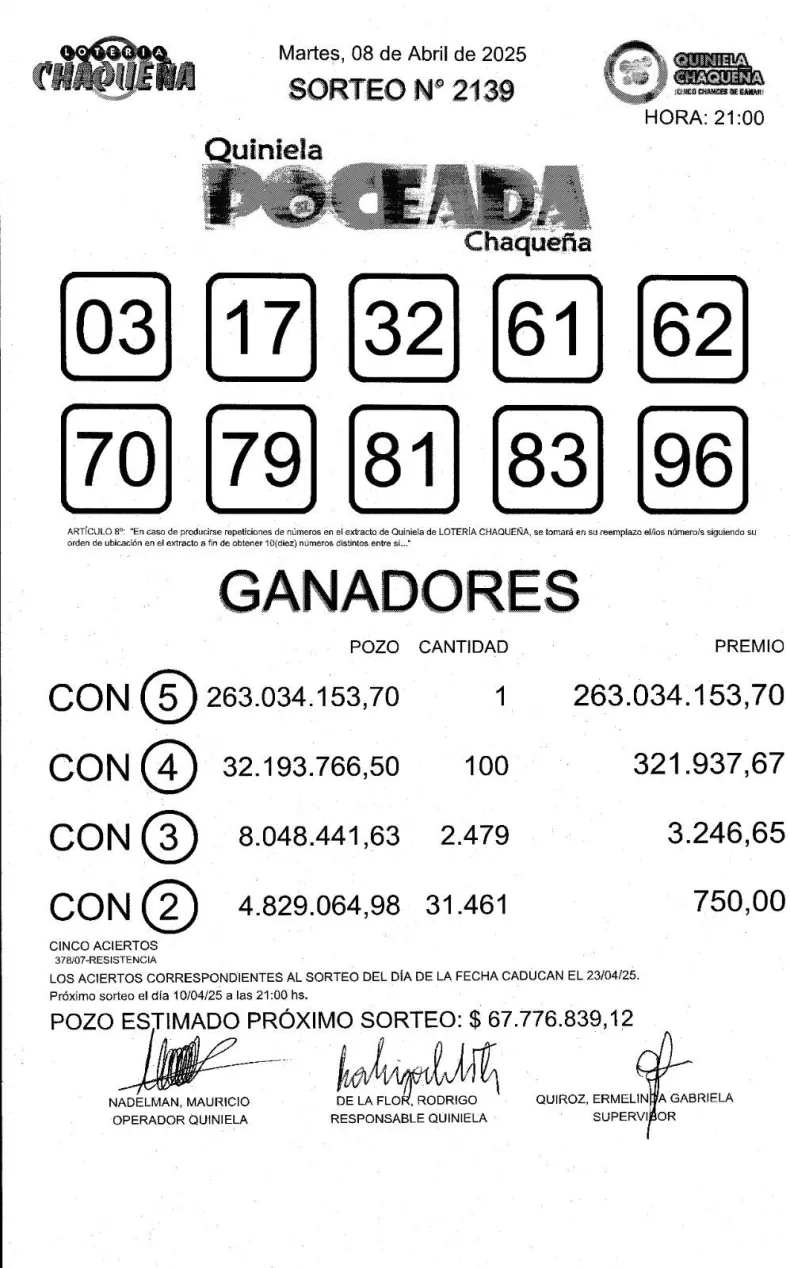 En la noche del martes, se llevó a cabo el sorteo N° 2139 que ponía en jugo un pozo de más de 263 millones de pesos. Finalmente, un vecino de la ciudad de Resistencia logró los cinco aciertos y se quedó el premio mayor. Los números de la suerte fueron: 17,62,70,79 y 96.