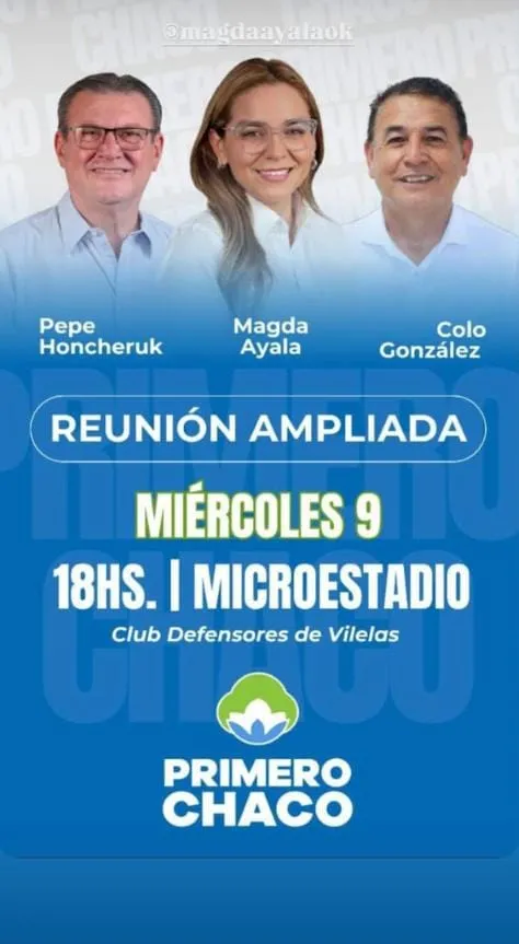 Este miércoles 9 de abril a las 18 horas, el espacio político Primero Chaco realizará una reunión ampliada en el microestadio del Club Defensores de Vilelas. El encuentro contará con la presencia de Atlanto "Pepe" Honcheruk, actual legislador provincial, Magda Ayala, intendente de Barranqueras y Marcelo "Colo" González, intendente de Puerto Vilelas.