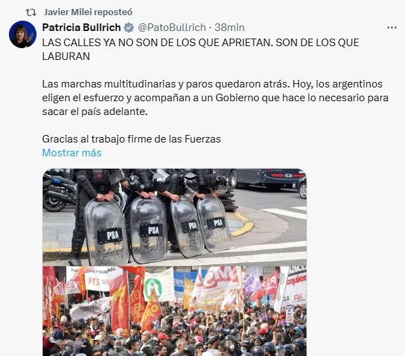 Asimismo, replicó a Patricia Bullrich quien publicó: "Las calles ya no son de los que aprietan. Son de los que laburan. Las marchas multitudinarias y paros quedaron atrás. Hoy, los argentinos eligen el esfuerzo y acompañan a un Gobierno que hace lo necesario para sacar el país adelante. Gracias al trabajo firme de las Fuerzas Federales garantizamos el control total del espacio público en paz. Sin violencia, no hay confrontación. Solo ley y orden".