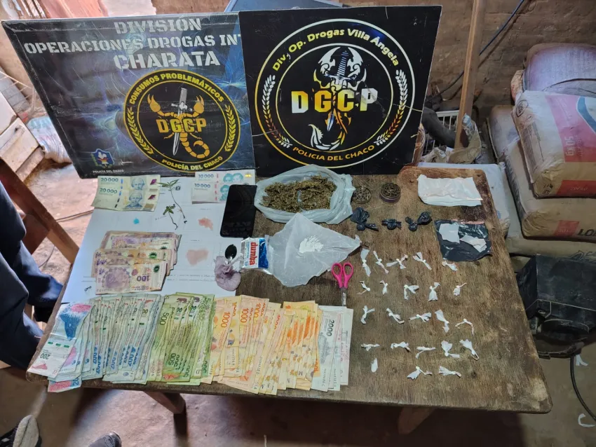 La División de Operaciones de Drogas de Charata realizó dos allanamientos en el barrio Centenario sobre dos bunker de narcomenudeo, en los que se encontraron diversos elementos que fueron incautados: en el primero, se secuestraron 12 envoltorios de nylon tipo "bochitas" de cocaína, seis de marihuana, un trozo compacto de 14 gramos de cocaína, un cigarrillo armado tipo "porro", $ 436 mil en efectivo, tres celulares, varios recortes de nylon, 44 pastillas y dos blíster de clonazepam, tres tijeras y una planta "cannabis sativa". Por éste allanamiento fueron detenidos R.B.M de 27 años y A.E.L de 70 años.