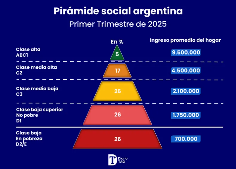 Días atrás el INDEC publicó la nueva pirámide social argentina exponiendo cuáles las clases sociales del país en base a los ingresos de los habitantes, actualmente son cinco: baja en pobreza, baja superior no pobre, media baja, media alta y alta.