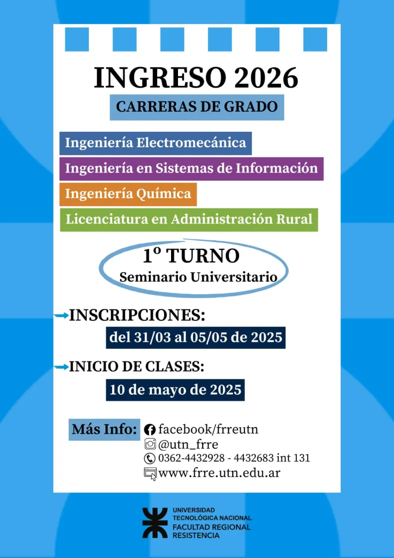 Hasta el lunes 5 de mayo se encuentra abierta la inscripción al Primer Turno del Seminario Universitario para ingresar en 2026 a las carreras de grado que se dictan en la Facultad Regional Resistencia de UTN.