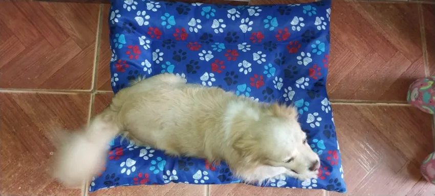 El perro tiene ocho años y es bajito, peludo y tiene la cola como un plumero color canela y una mancha blanca en la parte de arriba de su cuello.
