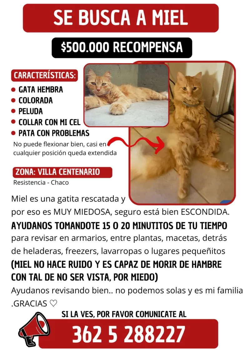 Miel es de color naranja, peluda, y se distingue por tener una patita con una condición que le impide doblarla correctamente, por lo que suele mantenerla extendida casi en cualquier posición. Además, según informó su dueña a Diario TAG, es muy miedosa y probablemente se encuentre escondida en algún lugar como una maceta, un armario o entre plantas.