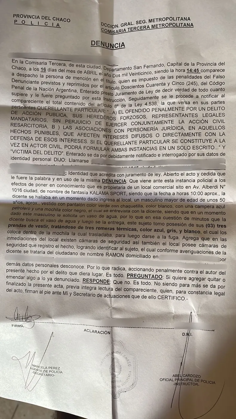 Según consta en la denuncia a la Diario TAG tuvo acceso, el presunto delincuente ya sería conocido en la zona de avenida Alberdi por tener un "frondoso prontuario" delictivo. A raíz de la situación, el propietario del comerció inició una campaña de difusión con el rostro del hombre para prevenir futuros robos a los demás locales.