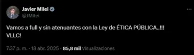 Otra señal de esto fue el anticipado festejo del presidente Javier Milei en sus redes sociales: "Vamos a full y sin atenuantes con la Ley de Ética Pública..!!! VLLC!". El mismo confirmaría que el oficialismo tiene todas las condiciones dadas para aprobar la Ficha Limpia en la posible sesión del jueves.