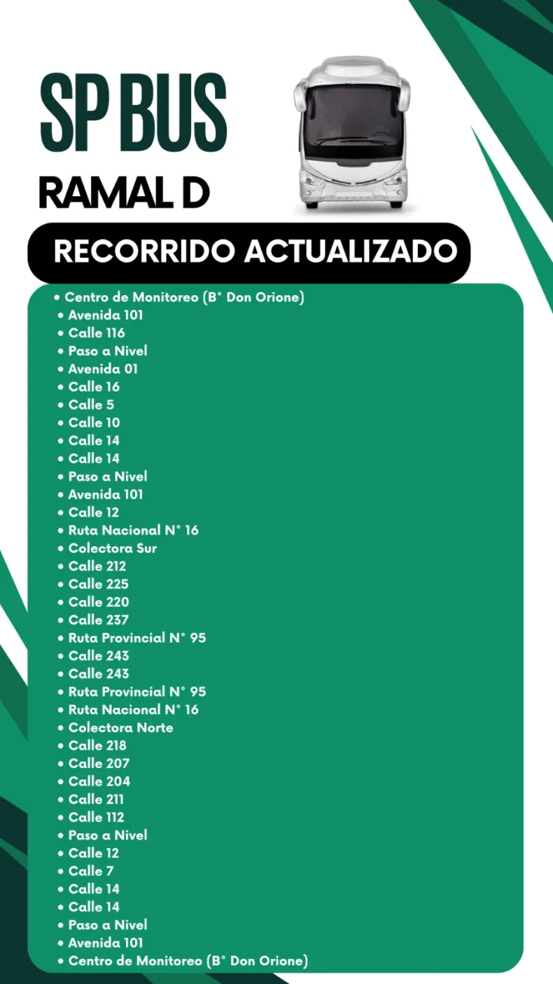 RAMAL D: Centro de Monitoreo, Avenida 101, Calle 116, Paso a Nivel, Avenida 1, Calle 16, Calle 5, Calle 10, Calle 14, Paso a Nivel, Avenida 101, Calle 12, Ruta Nacional N° 16, Colectora Sur, Calle 212 del San Cayetano, Calle 225, Calle 220, Calle 237, Ruta Provincial N° 95, Calle 243, Ruta Provincial N° 95, Ruta Nacional N° 16, Colectora Norte, Calle 218 de Lamadrid, Calle 207, Calle 204, Calle 211, Calle 112, Paso a Nivel, Calle 12, Calle 7, Calle 14, Paso a Nivel, Avenida 101 y finaliza en el Centro de Monitoreo.