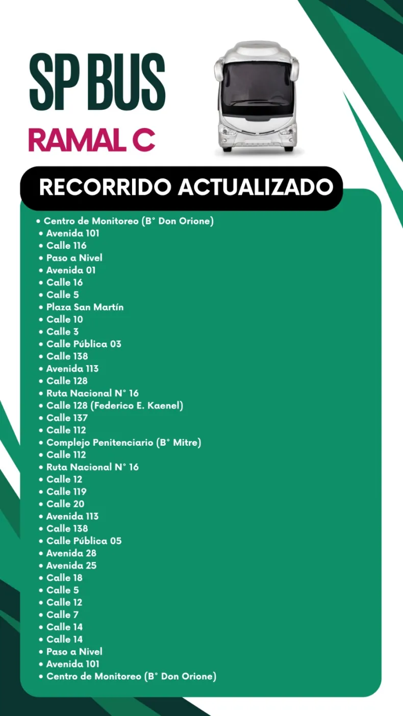RAMAL C: iniciará en el Centro de Monitoreo, continuando por Avenida 101, Calle 116, Paso a Nivel, Avenida 01, Calle 16, Calle 5, Plaza San Martín, Calle 10, Calle 3, Calle 3 del Ensanche Sur, Calle 138, Avenida 113 (Carlos Gardel), Calle 128, Ruta Nacional N° 16, Calle 128 (Federico E. Kaenel), Calle 137, Calle 112, Complejo Penitenciario (B° Mitre), Calle 112, Ruta Nacional N° 16, Calle 12, Calle 119, Calle 20, Avenida 113, Calle 138, Calle 5 del Ensanche Sur, Avenida 28, calle 25, Calle 18, Calle 5, Calle 12, Calle 7, Calle 14, Paso a Nivel, Avenida 101 y finaliza en el Centro de Monitoreo.