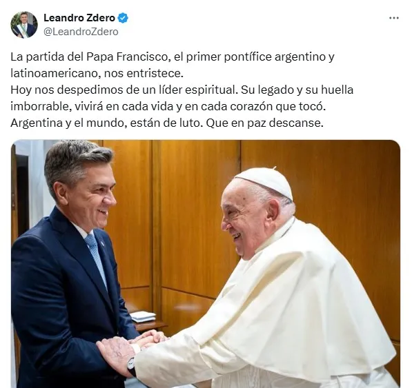 "La partida del Papa Francisco, el primer pontífice argentino y latinoamericano, nos entristece. Hoy nos despedimos de un líder espiritual. Su legado y su huella imborrable, vivirá en cada vida y en cada corazón que tocó. Argentina y el mundo, están de luto. Que en paz descanse.", expuso Zdero.