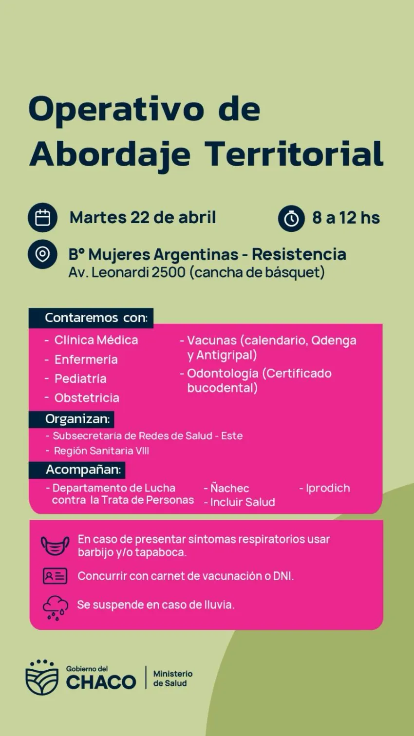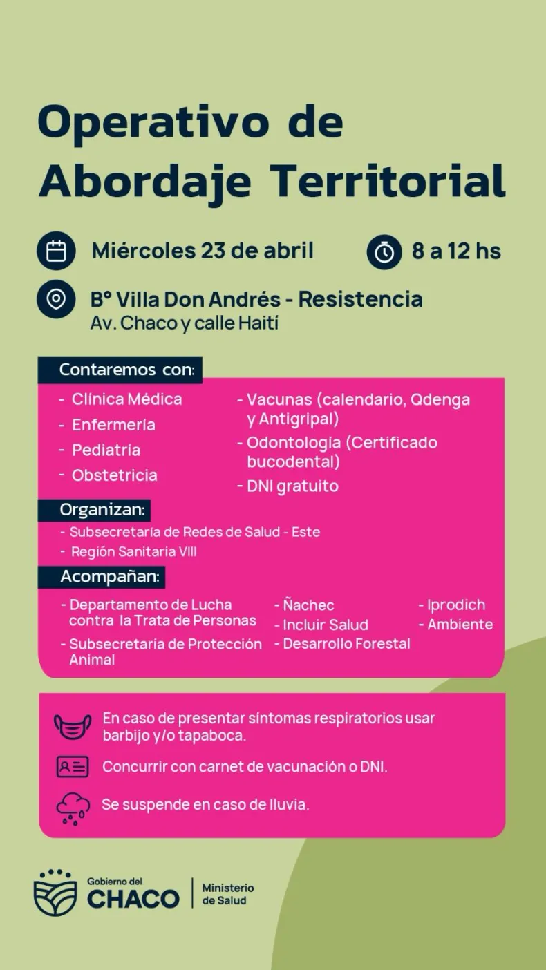 El Ministerio de Salud del Chaco realizará nuevos operativos de abordaje territorial esta semana en la ciudad de Resistencia. Las jornadas se llevarán a cabo el martes 22 de abril en el barrio Mujeres Argentinas y el miércoles 23 en Villa Don Andrés, en el horario de 8 a 12.