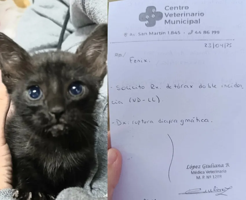"Fénix" es un gatito rescatado que hoy lucha por su vida. Días atrás fue atacado por un perro y sufrió la rotura del diafragma, una lesión que requiere atención veterinaria urgente. Para continuar con su tratamiento necesita una placa radiográfica, pero sus cuidadores no pueden afrontar el costo del estudio.
