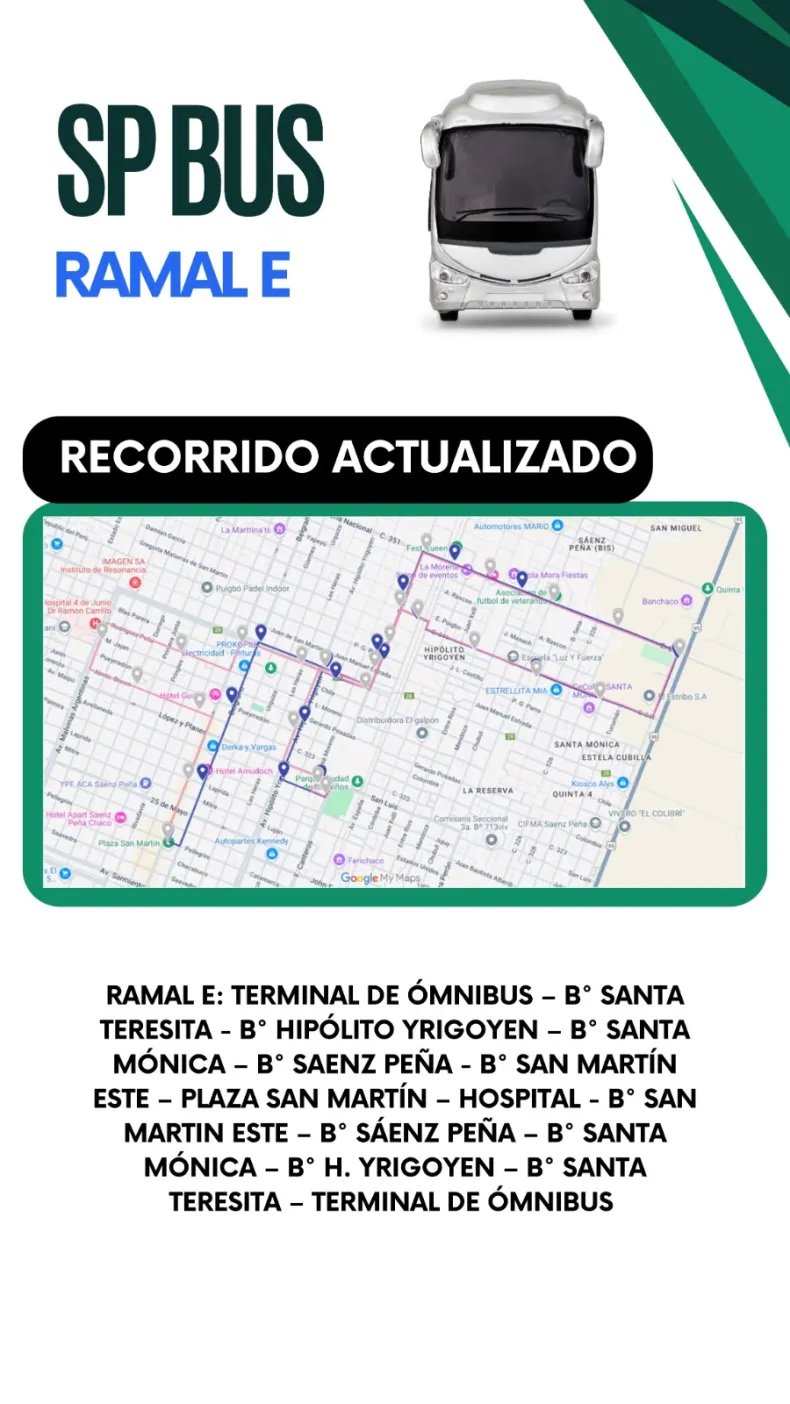 El sistema de Transporte Público Municipal de Sáenz Peña, continúa ampliando sus recorridos para optimizar el servicio, por lo que desde el lunes 28 de abril se ampliará el recorrido del Ramal E generando una conexión hacia el Hospital, instituto Mantovani y zonas aledañas.
