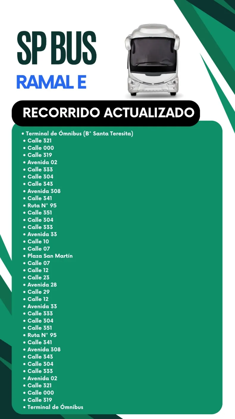 RAMAL E: parte desde la Terminal de Ómnibus (B" Santa Teresita), calle 321, calle 000, calle 319, Avenida 02, calle 333, calle 304, calle 343, avenida 308, calle 341, colectora Ruta N° 95, calle 351, calle 304, calle 333, avenida 33, calle 10, calle 07, plaza San Martín, calle 7, calle 12, calle 23, avenida 28, calle 29, calle 12, avenida 33, calle 333, calle 304, calle 351, colectora Ruta Provincial N° 95, calle 341, avenida 308, calle 343, calle 304, calle 333, avenida 02, calle 321, calle 000, calle 319 y finaliza en Terminal de Ómnibus.