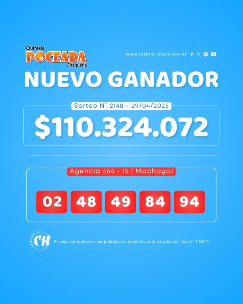 Un vecino de Machagai se convirtió en millonario tras acertar los cinco números ganadores del sorteo de La Poceada Chaqueña realizado este martes. Según informó Lotería Chaqueña, el afortunado se llevó un premio de 110.324.072 de pesos.
