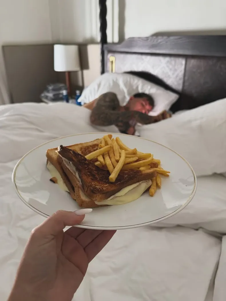 Una de las postales más comentadas fue la de un desayuno en la cama: mientras Enzo descansaba, Valentina le llevó un plato con tostados y papas fritas, gesto que sus seguidores celebraron con ternura y mensajes de apoyo. En la misma publicación, también mostró sus looks deportivos y una foto junto a Enzo en el auto, donde se los vio sonrientes y relajados.