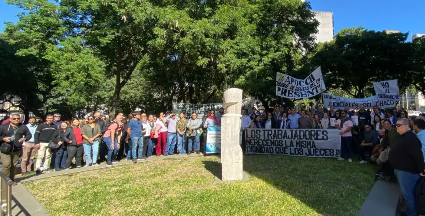 El miércoles a las 11 horas, Intergremial Judicial, junto con los gremios del Tribunal de Cuentas y de Fiscalía de Estado de la provincia del Chaco, llevaron a cabo un paro de actividades con manifestación en las torres de las avenidas Sarmiento y Laprida en contra del desenganche.