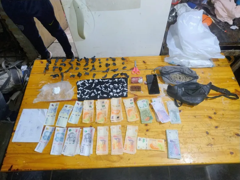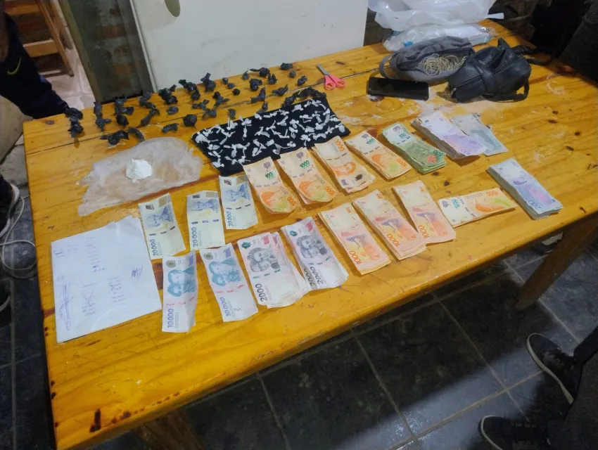 Durante el allanamiento, agentes incautaron 38,3 gramos de cocaína distribuidos en 44 envoltorios y 67 gramos de marihuana fraccionados en 42 bochitas, además de $ 193.700 en efectivo. También se secuestraron elementos utilizados para el fraccionamiento y venta de drogas, como tijeras, bolsas, un cuaderno con anotaciones y un teléfono celular.