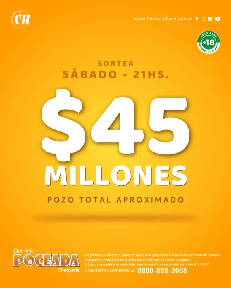 Este sábado a las 21, la Quiniela Poceada Chaqueña pone en juego un pozo acumulado de más de $ 45.000.000, ofreciendo una nueva oportunidad para los apostadores que buscan llevarse el premio mayor.
