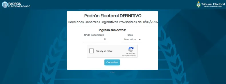 Para consultar el padrón electoral definitivo provincial hay que dirigirse a la página oficial del padrón electoral de Chaco , ingresar el número de DNI y el género. Luego, hay que confirmar un Captcha y finalmente darle clic a "Consultar", para saber los datos necesarios para la elección.
