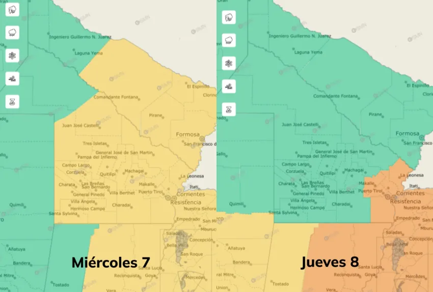 Por otro lado, para este jueves 8 de mayo se emitió una alerta naranja, con mayor foco en Resistencia, el área metropolitana y localidades aledañas, lo que implica un nivel de riesgo superior por fenómenos meteorológicos más intensos y potencialmente peligrosos.