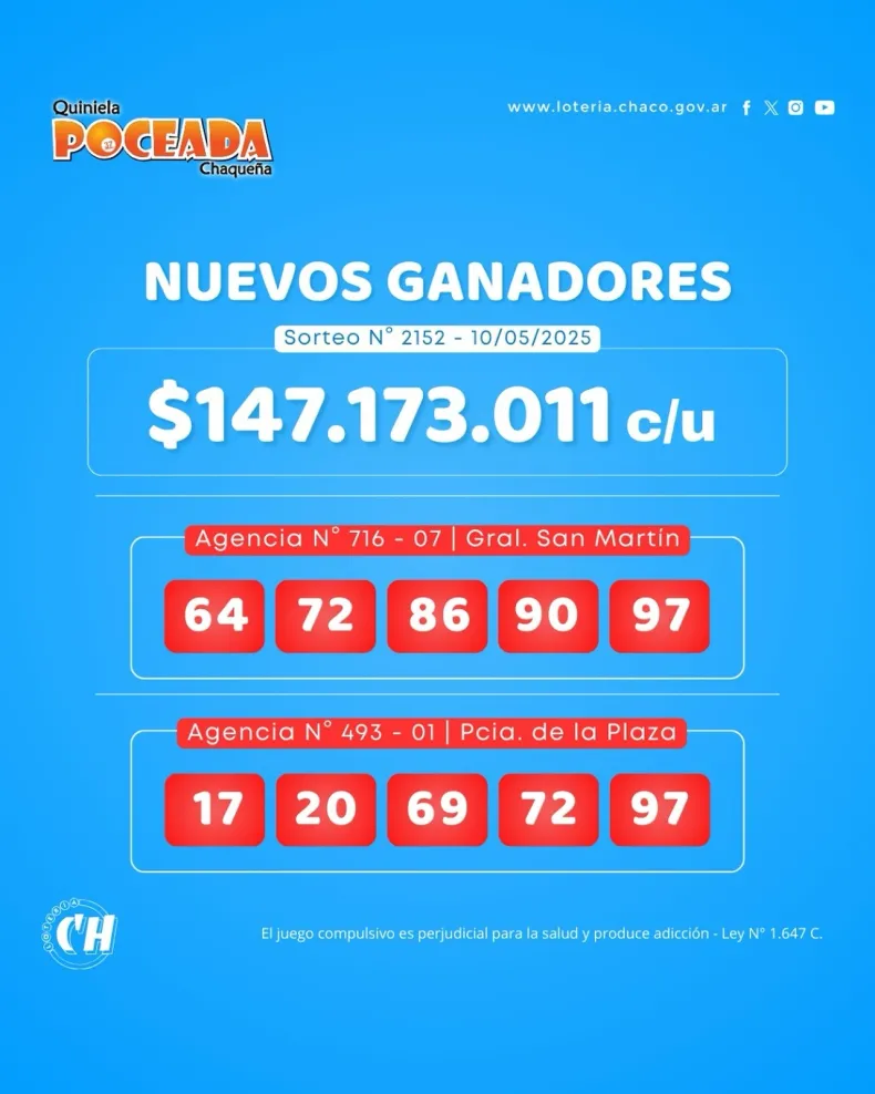 Por otro lado, la otra jugada con suerte se hizo en la Agencia N 493-01 de la localidad de Presidencia de la Plaza. Los números fueron 17, 20, 69, 72 y 97.