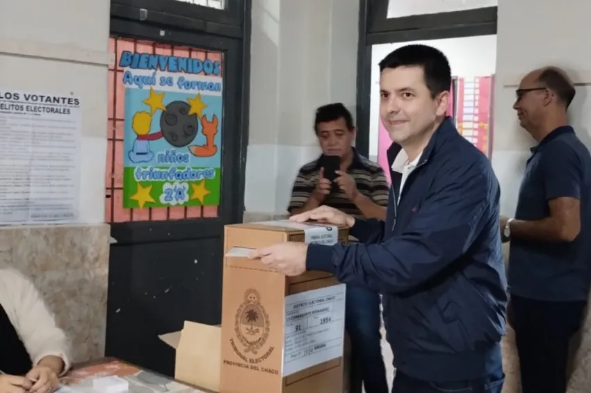 El intendente de Presidencia Roque Sáenz Peña, Bruno Cipolini, votó este domingo en la Escuela N° 252, minutos antes del cierre de los comicios. Estuvo acompañado por su padre, el diputado nacional Gerardo Cipolini.