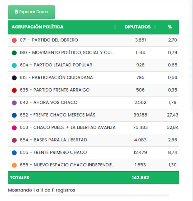 La lista apoyada por el Gobierno provincial logró el 52,84% de los votos, consolidando su liderazgo en la ciudad. En segundo lugar quedó el Frente Chaco Merece Más, con el 27,43%, mientras que el Frente Primero Chaco, encabezado por Magda Ayala y Atlanto Honcheruk, alcanzó el 8,74% y se ubicó como tercera fuerza.