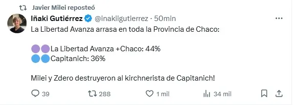 Apenas se conocieron los primeros datos oficiales, Milei compartió mensajes en su cuenta de X que destacaban el desempeño electoral de su espacio político. "La Libertad Avanza arrasa en toda la provincia de Chaco: La Libertad Avanza + Chaco: 44%, Capitanich: 36%. Milei y Zdero destruyeron al kirchnerista Capitanich", publicó el influencer libertario Iñaki Gutiérrez, en un mensaje que fue rápidamente replicado por el mandatario nacional.