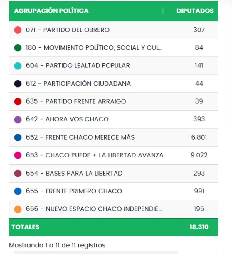 El frente Chaco Puede + La Libertad Avanza obtuvo 8.680 votos y se quedó con el 49,2% del total de sufragios en la localidad de General San Martín, logrando una ventaja de más de 10 puntos sobre su principal competidor, Chaco Merece Más. Este último, liderado por el exgobernador Jorge Milton Capitanich, alcanzó un 37,2% con un total de 6.563 votos.