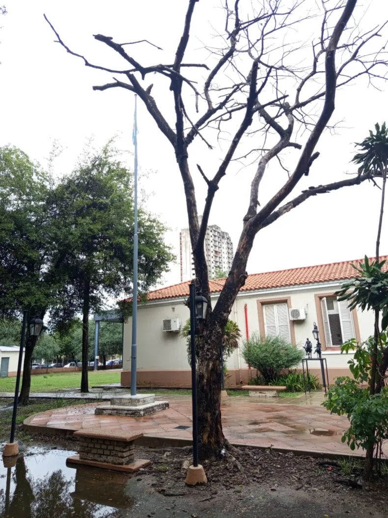 Vecinos y familias reclaman la extracción urgente de un árbol seco en la Escuela Nº 2