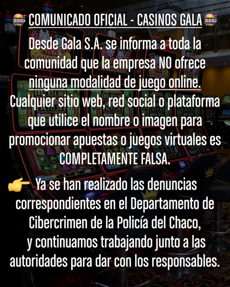 Desde 𝐆𝐚𝐥𝐚 𝐒.𝐀. informaron a toda la comunidad que la empresa no ofrece ninguna modalidad de juego online. "Cualquier sitio web, red social o plataforma que utilice el nombre o imagen para promocionar apuestas o juegos virtuales advierten que es completamente falsa".