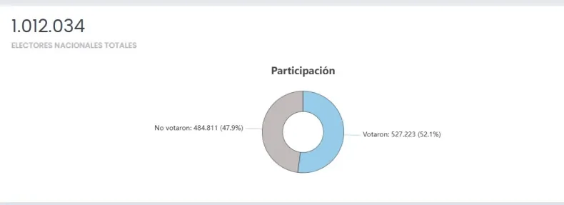 De un total de 1.012.034 electores habilitados, 527.223 asistieron a las urnas, mientras que 484.811 se ausentaron, lo que representa el 47,9% del padrón. Estas personas deberán justificar su inasistencia ante la Justicia Electoral, ya que el voto es obligatorio para todos los ciudadanos de entre 18 y 70 años.