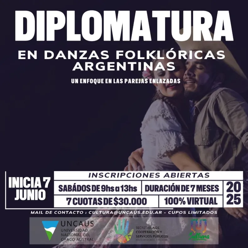 La Universidad Nacional del Chaco Austral (UNCAUS), a través del área de Cultura de la Secretaría de Cooperación y Servicios Públicos, anuncia el lanzamiento de la "Diplomatura en Danzas Folklóricas Argentinas: un enfoque en las parejas enlazadas". Se trata de una propuesta de formación artística que comenzará el sábado 7 de junio de 2025, con modalidad virtual y sincrónica, a través de la plataforma de Google Meet.
