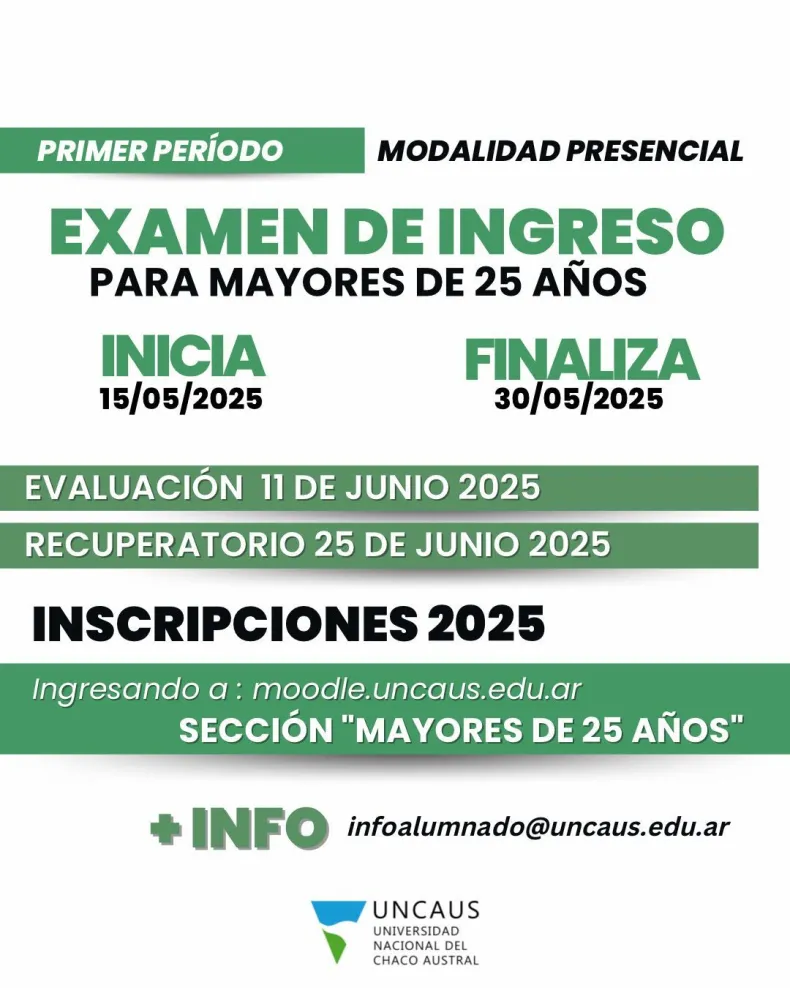 La Universidad Nacional del Chaco Austral (UNCAUS) a través de Secretaría Académica, informa que se encuentran abiertas las inscripciones, hasta el 30 de mayo de 2025, para aquellas personas mayores de 25 años que no poseen título de nivel secundario y que deseen estudiar una carrera presencial o a distancia en la institución, en el Ciclo Lectivo 2026.