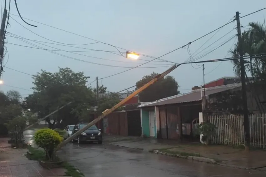 Según se pudo constatar en el lugar, los postes están completamente derribados y los cables del tendido eléctrico quedaron extendidos sobre la calzada, lo que representa un serio peligro para peatones y conductores que transitan por la zona.