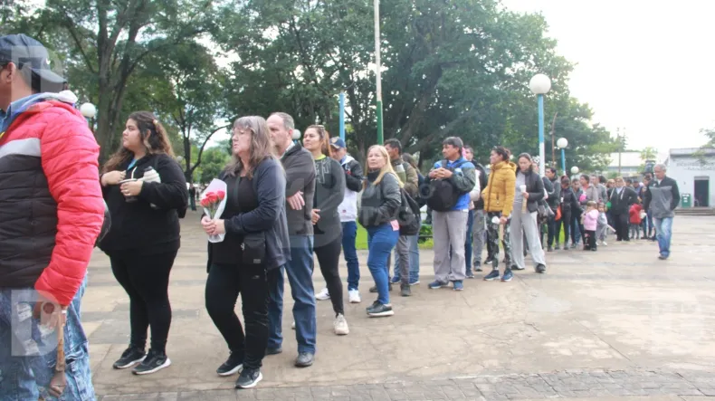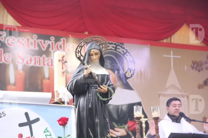 La plaza que rodea a la parroquia está repleta son cientos los fieles que esperan para ingresar a la iglesia, ver a Santa Rita y dejar ofrendas, la fila comienza desde la figura de la santa y sale a la plaza y supera más de dos cuadras. El frío se apodera del lugar, pero hay forma de aliviarlo, un grupo de voluntarios reparte chocolate caliente, cocido y panes para quienes esperan.