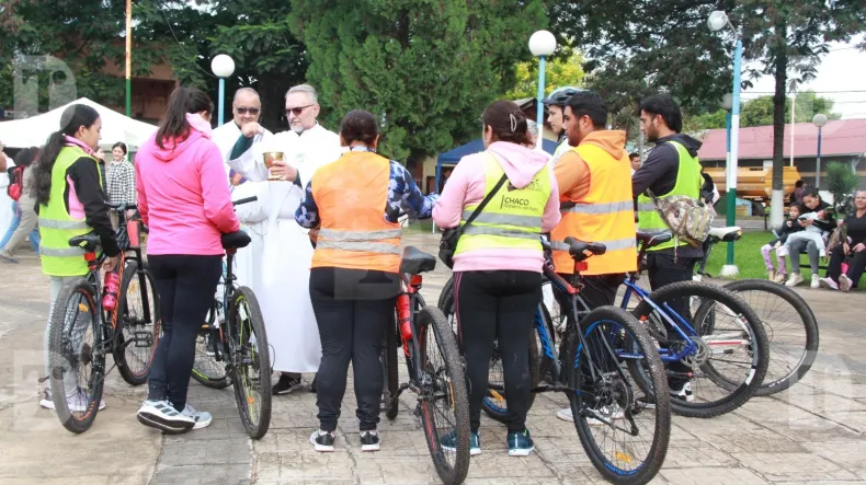 Nuevamente en la plaza un gran grupo llama la atención de los presentes, son una familia que viajó desde La Verde en bicicleta, tuvieron que parar en Makallé por la lluvia y espetar a que escampe para seguir, por supuesto eso no los detuvo y llegaron a Tirol en cuatro horas, recibieron la bendición y una de los sacerdotes los roció con agua bendita.