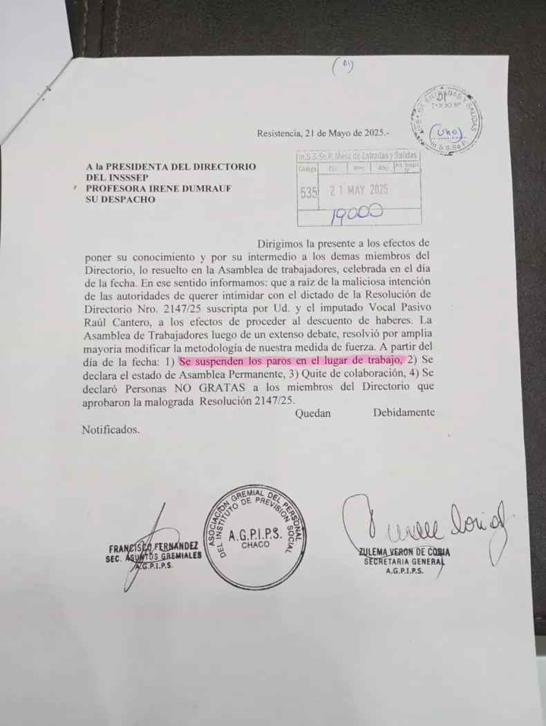 El comunicado expresa lo siguiente: "A raíz de la maliciosa intención de las autoridades de querer intimidar con el dictado de la Resolución del Directorio suscripta por Dumrauff y el imputado vocal pasivo Raúl Cantero, con el objetivo de descontar los haberes, decidimos levantar la medida de fuerza, declarar estado de Asamblea Permanente, quite de colaboración y declarar personas no gratas a todos los miembros del directorio que aprobaron esta malograda resolución".