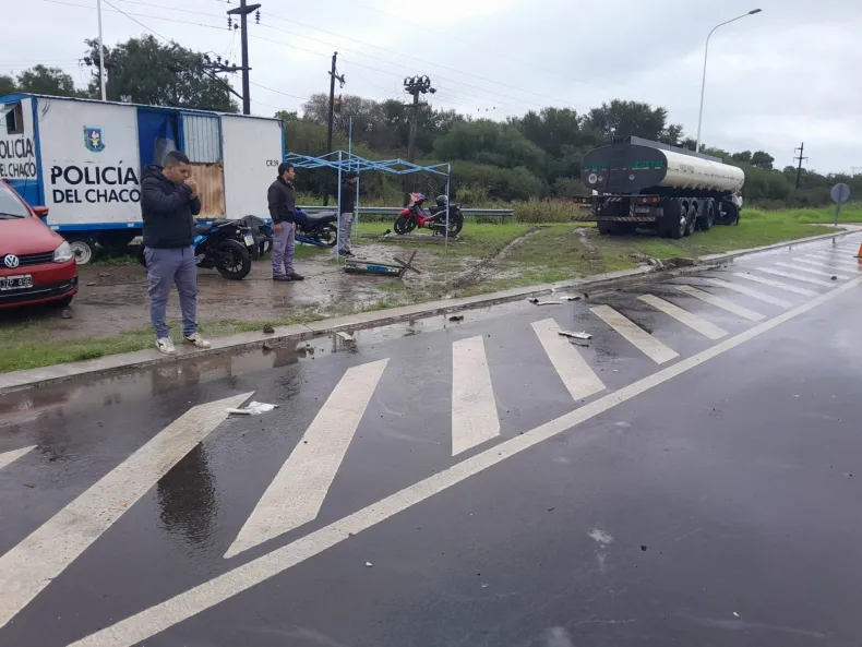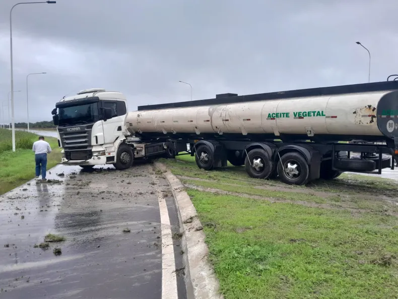 En el mediodía de este martes un camión marca Scania proveniente de Paraguay terminó sobre el cordón en la Ruta Provincial N° 13 y Ruta Nacional N° 11, luego de que el conductor perdiera el control debido a que la cinta asfáltica estaba mojada por las intensas lluvias en la provincia.