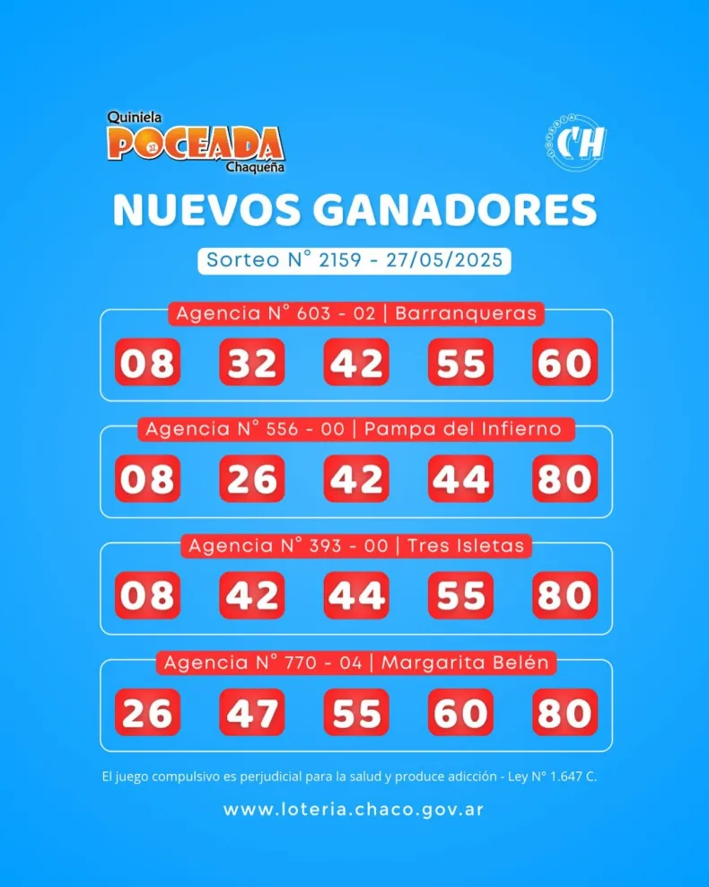 Cuatro apostadores de la provincia se llevaron una suma millonaria tras acertar los números ganadores de la Poceada Chaqueña. El sorteo de este martes 27 de mayo por la noche había dejado un pozo de más de 246 millones de pesos, que finalmente fue repartido en partes iguales.
