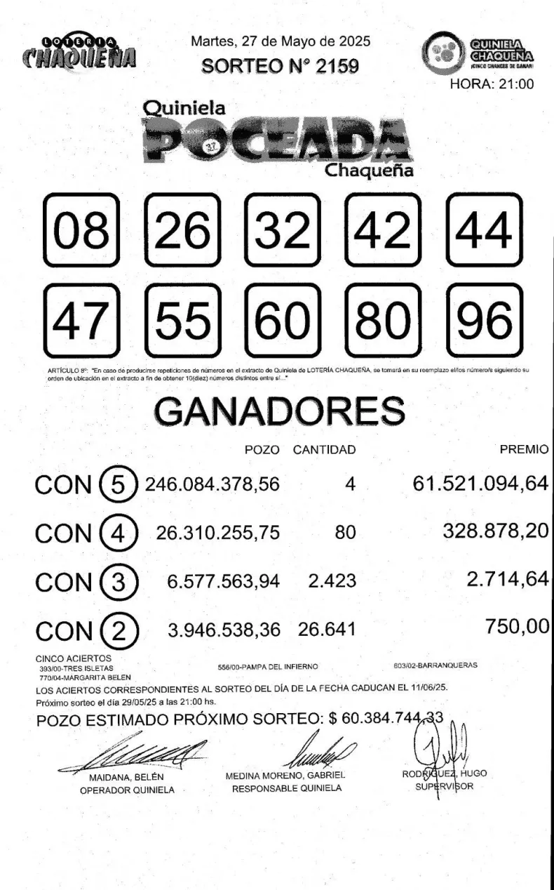 Cinco apostadores se repartieron un pozo de $ 61.521.094 en el sorteo N° 2159 de la Poceada Chaqueña, realizado este martes a las 21 horas.